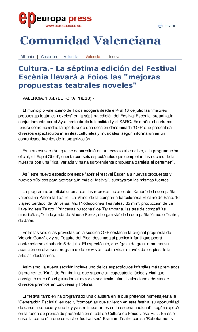 La séptima edición del Festival Escènia llevará a Foios las «mejoras propuestas teatrales noveles»