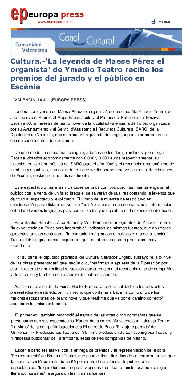 «…y la leyenda de Maese Pérez el organista es la obra de ymedioteatro con la que el grupo jiennense consiguió, el pasado fin de semana, los premios al mejor espectáculo y el Premio del Público en la Séptima edición de Escènia, la muestra de teatro novel del municipio valenciano de Foios.