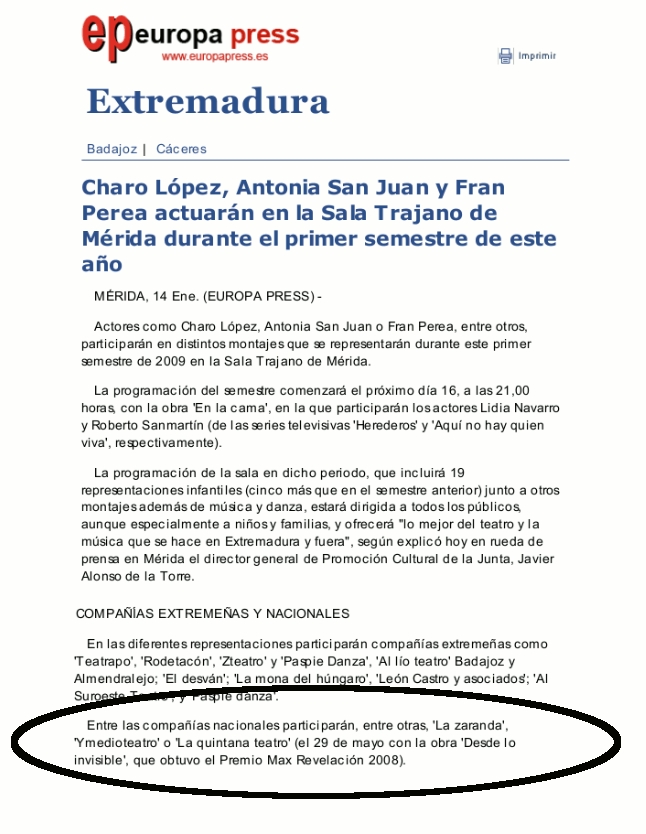 Entre las compañías nacionales participarán, entre otras, ‘La zaranda’, ‘ymedioteatro’ o ‘La quintana teatro’ (el 29 de mayo con la obra ‘Desde lo invisible’, que obtuvo el Premio Max Revelación 2008).
